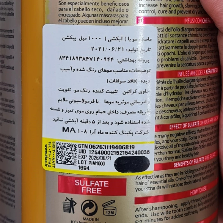 ماسک مو فری سولفات کراتین پیکشن 1 لیتر (با ابکشی)