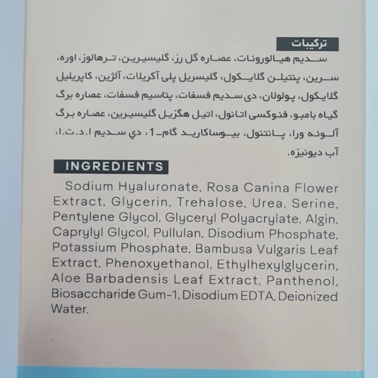 سدیم هیالورونات، عصاره گل رز، گلیسیرین، ترهالوز، اوره، سرین، پنتیلن گلایکول، گلیسریل پلی آکریلات، آلژین، کاپریلیل گلایکول، پولولان، دی سدیم فسفات، پتاسیم فسفات، عصاره برگ گیاه بامبو، فنوکسی اتانول، اتیل هگزیل گلیسیرین، عصاره برگ آلوئه ورا، پانتنول، بیوساکارید گام-1 دی سدیم ا د ت ا، آب دیونیزه