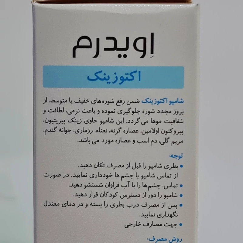 . اکتوزینک، ضدشوره روزانه حاوی اکتوپیروکس و پریتیون زینک، روغن درخت چای . برطرف کننده انواع شوره های خفیف تا متوسط و پیشگیری از ایجاد آن . شامپو اویدرم ضد شوره دارای خاصیت ضدقارچ، ضد خارش و ضد التهاب . حفظ نرمی، شفافیت و شادابی مو . حاوی عصارههای طبیعی و گیاهی مؤثر در از بین بردن شوره و خارش . مناسب برای مصرف روزانه و مستمر . پیشگیری از خارش و پوسته پوسته شدن سر . موثر در رفع قرمزی و التهاب پوست سر . مؤثر در تنظیم pH و ترشحات غدههای چربی موجود در پوست سر .ترمیم و افزایش حالتپذیری موهای آسیبدیده