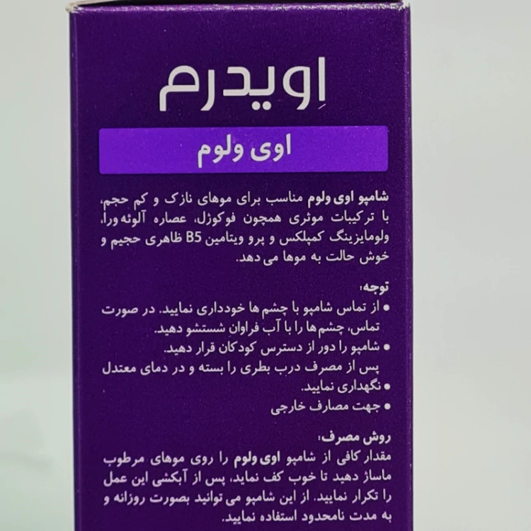 مشخصات شامپوی اوی ولوم اویدرم: افزایش ضخامت و حجم مو تقویت و افزایش استحکام تار مو رطوبت رسانی طولانی به موها افزایش حالت پذیری مو حفظ سلامت و درخشندگی مو