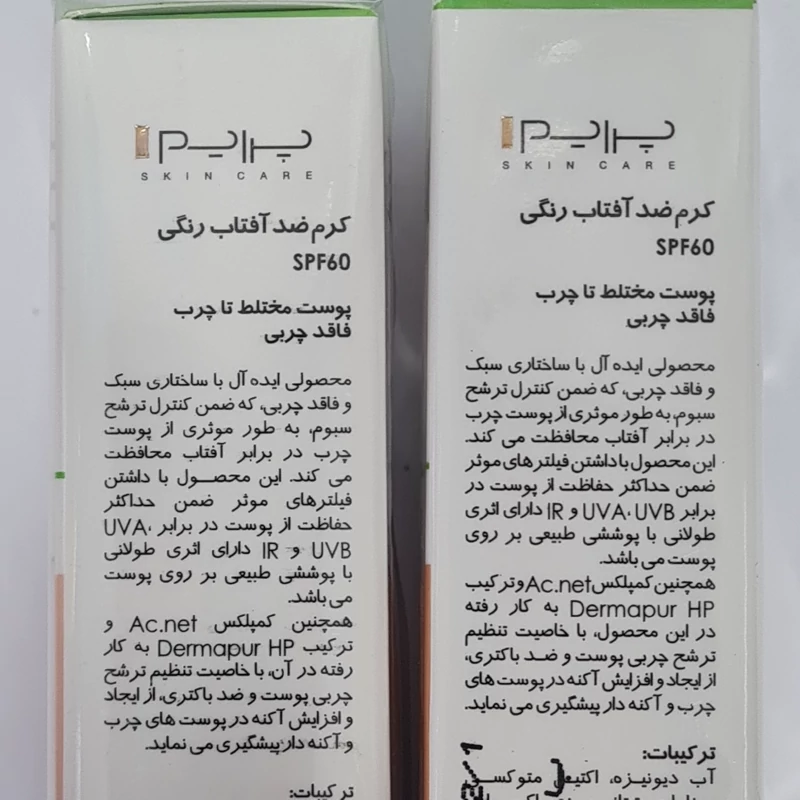 خواص ضدآفتاب پریم برای پوست چرب ضد آفتاب پریم رنگی برای پوست چرب حاوی فیلترهایی است که نقش موثری در جلوگیری از آسیب اشعه فرابنفش به پوست دارند. این کرم با داشتن کمپلکس Ac.net و عصاره طبیعی گیاه عروس چمنزار، در تنظیم ترشح سبوم پوست چرب و هم چنین کاهش رشد و تکثیر باکتری های مولد آکنه اثرگذار است. مزایای ضد آفتاب پریم مناسب پوست چرب محافظت کننده ای موثر در برابر اشعه های UVA، UVB و IR دارای بافتی سبک و زود جذب کاهش دهنده ترشح سبوم پوشاننده لک های پوستی مات کننده پوست غیر کومدون زا فاقد چربی