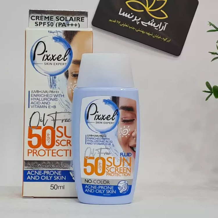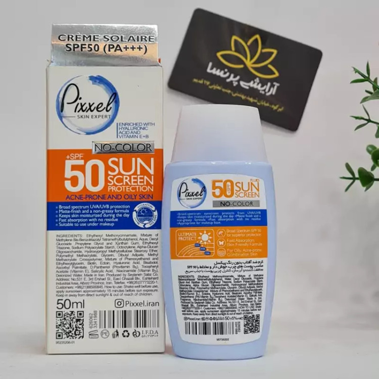 از ویژگی های ضد آفتاب بی رنگ پیکسل مناسب پوست چرب و مختلط : دارای فاکتور محافظتی +++ PA برای مقاومت در برابر UVA قابل مقایسه با برندهای بین المللی مانند ایزدین کاهش تولید ملانین حاوی هیالورونیک اسید، پرو ویتامین B5، ویتامین E و B رفع لک و کک و مک کمرنگ کردن جای جوش و تیرگی پوست ضد پیری حاوی بیزابولول و سالیسیلیک اسید مرطوب کننده و آبرسان جوان کننده افزایش خاصیت کشسانی پوست و قابلیت انعطاف آن طراوت بخش بدون اثر سفیدی بر پوست ضد حساسیت حجم 50 میلی لیتر