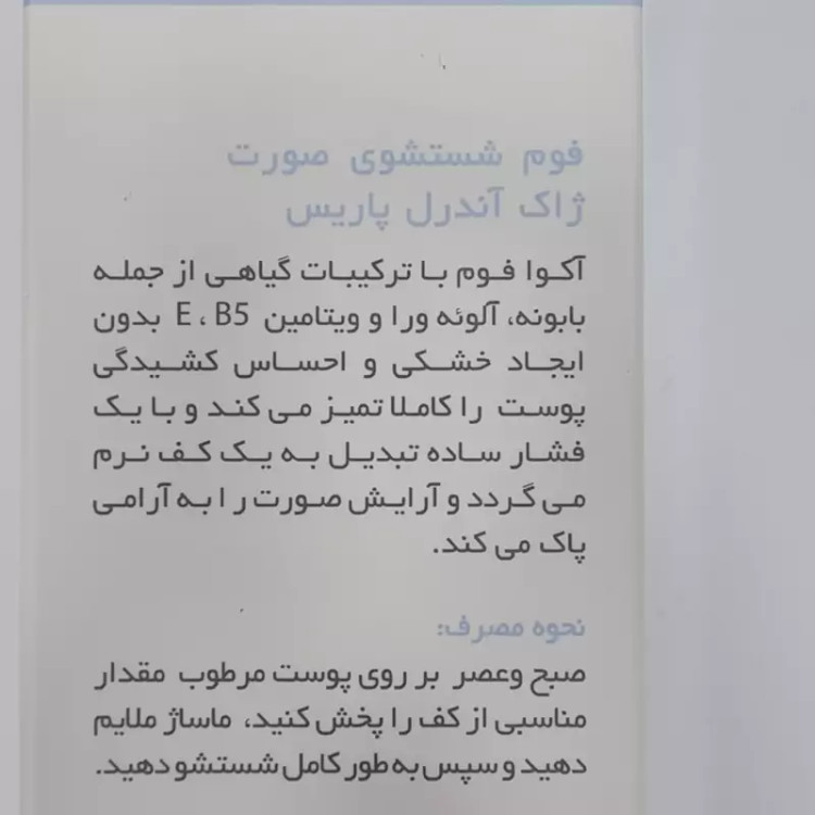 مناسب انواع پوست دارای pH سازگار با پوست فاقد سولفات و مواد صابونی کنترل چربی، آبرسان و رطوبت رسان بدون تست حیوانی حجم محصول: 150میل . . فوم شستشو صورت برند ژاک آندرل پاریس ، برای آن دسته از افرادی که خشکی پوست دارند؛ بسیار مناسب خواهد بود. با توجه به ویژگی ها و فرمولاسیون قوی که این فوم شستشو دارد؛ مسلماً از التهاب و خشکی پوست کاسته شده و از سوی دیگر، باعث آبرسانی، رفع قرمزی و التهاب پوست خواهد شد.