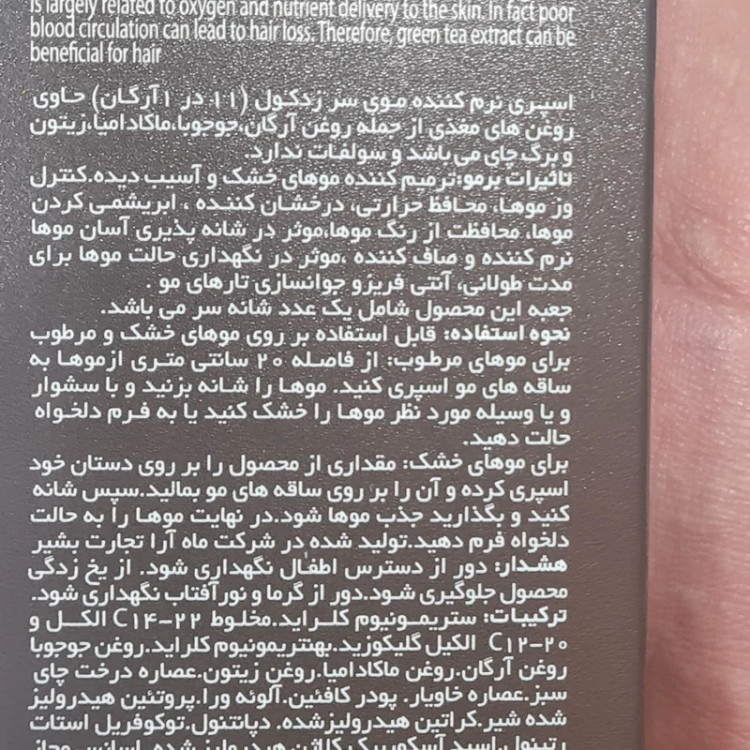 فاقد سولفات و پارابن از بین برنده خشکی و شکنندگی مو ضد وز جلوگیری از ریزش موها و تقویت پیاز مو تغذیه کننده و درخشان کننده حاوی روغن گیاه کاکائو براق و شفاف کننده ی موهای کدر ضد الکتریسته حاوی مواد معدنی مغذی مرطوب کننده موها نرم کننده و خوش حالت کننده ی موهای مجعد و فر (توجه بفرمایید که فر موهاتونو باز نمی کند و کمک می کند موهای حالت دار و زیبا بدون وز داشته باشید) مناسب موهایی که زیاد گره میخورند یا حالت دار، مجعد و فر هستند ضد حرارت و محافظ حرارتی مناسب برای استفاده قبل از براشینگ و اتومو و انواع وسایل حرارتی حاوی گوگرد تصفیه شده و مفید جهت تغذیه کننده الیاف مو براق و درخشان کننده مو حاوی کراتین و ابریشمی کننده مو حاوی عصاره ی پیاز بنفش، تغذیه و تقویت کننده ی مو افزایش رشد قدی مو حاوی روغن های مغذی ترمیم کننده تثبیت و براق کننده ی رنگ مو بدون نیاز به ابکشی مناسب موهای ویتامینه و کراتینه شده و دکلره شده آبرسان و ضد حساسیت پوست سر